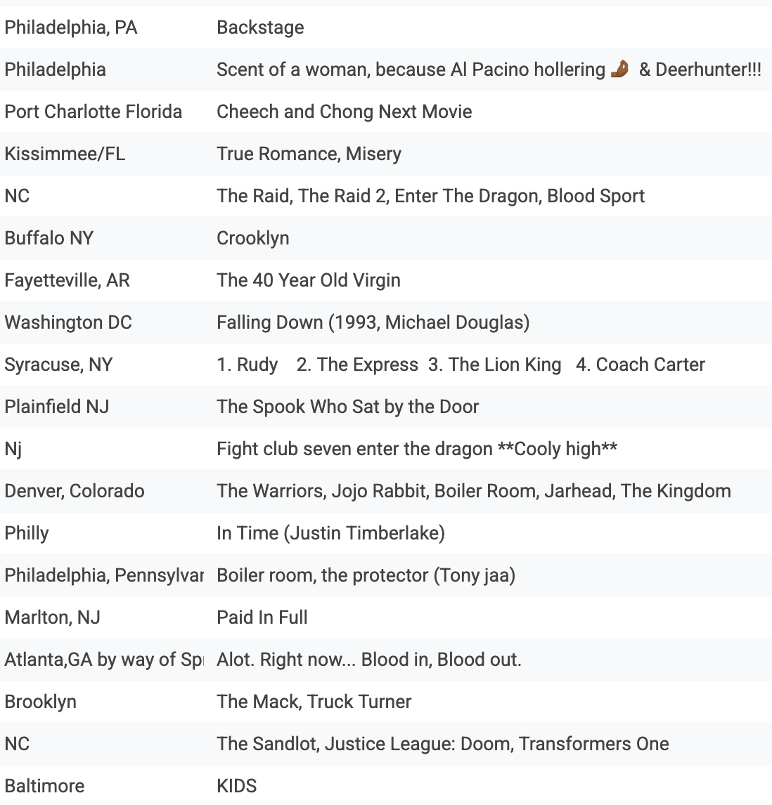 We’ve never had more submissions to our Movie Suggestion Doc than this past week — so many that I couldn’t even fit them all into one screenshot. So, here’s the most recent 20. There’s too many to give my opinion on, but — continue to send them in!